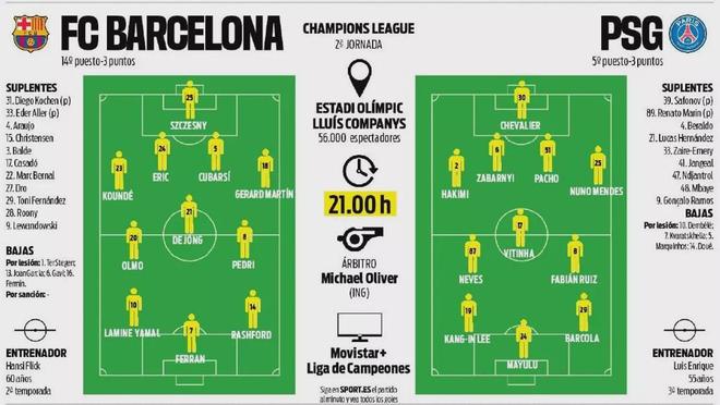 每体预测巴萨vs巴黎:亚马尔PK巴尔克拉,什琴斯尼先发