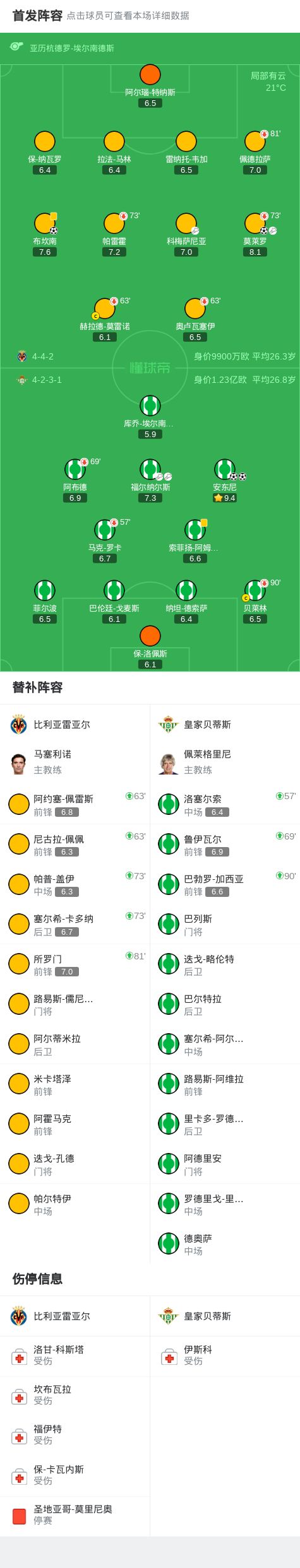 北京时间10月19日西班牙足球甲级联赛 联赛 第9轮,比利亚雷亚尔主场对阵皇家贝蒂斯。比利亚雷亚尔布坎南破门,莫莱罗破门。皇家贝蒂斯安东尼梅开二度。最终比分比利亚雷亚尔 2-2 皇家贝蒂斯。